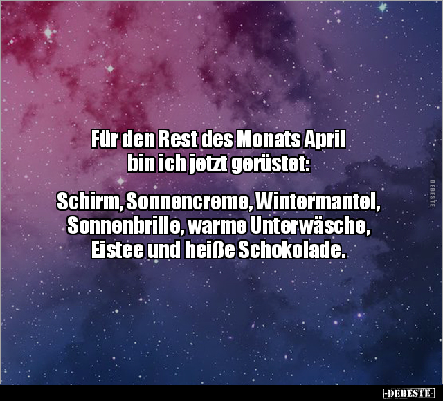 Für den Rest des Monats April bin ich jetzt gerüstet: Schirm, Sonnencreme, Wintermantel, Sonnenbrille, warme Unterwäsche, Eistee und heiße Schokolade.