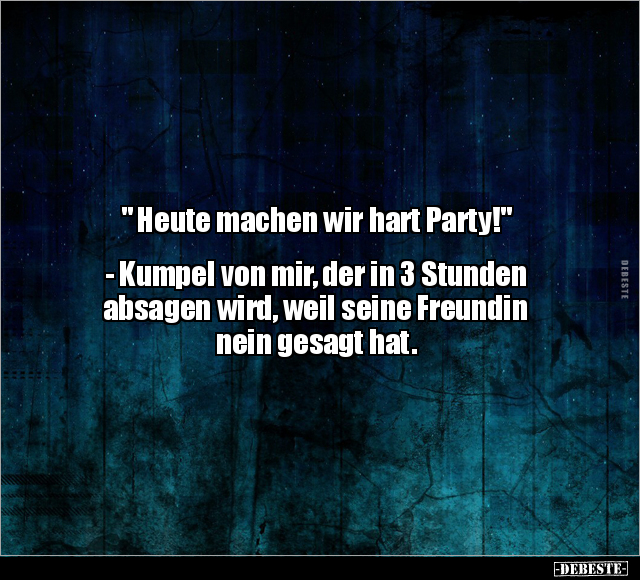 " Heute machen wir hart Party!" - Kumpel von mir, der in 3 Stunden absagen wird, weil seine Freundin nein gesagt hat.