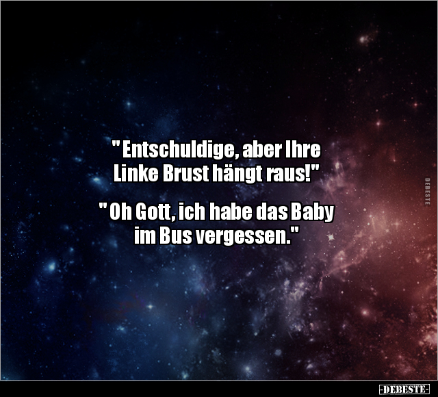 " Entschuldige, aber Ihre Linke Brust hängt raus!" " Oh Gott, ich habe das Baby im Bus vergessen."