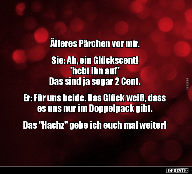Älteres Pärchen vor mir. Sie: Ah, ein Glückscent! *hebt ihn auf* Das sind ja sogar 2 Cent. Er: Für uns beide. Das Glück weiß, dass es uns nur im Doppelpack gibt. Das "Hachz" gebe ich euch mal weiter!