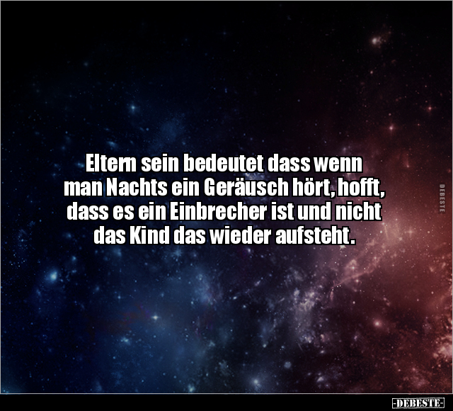 Eltern sein bedeutet dass wenn man Nachts ein Geräusch hört, hofft, dass es ein Einbrecher ist und nicht das Kind das wieder aufsteht.