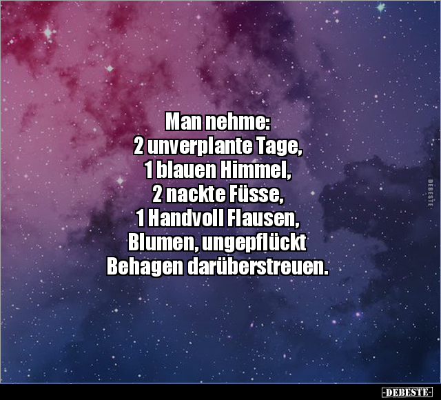Man nehme: 2 unverplante Tage, 1 blauen Himmel, 2 nackte Füsse, 1 Handvoll Flausen, Blumen, ungepflückt Behagen darüberstreuen.