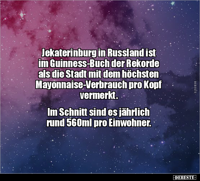 Jekaterinburg in Russland ist im Guinness-Buch der Rekorde als die Stadt mit dem höchsten Mayonnaise-Verbrauch pro Kopf vermerkt. Im Schnitt sind es jährlich rund 560ml pro Einwohner.