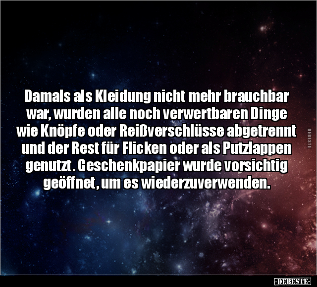 Damals als Kleidung nicht mehr brauchbar war, wurden alle noch verwertbaren Dinge wie Knöpfe oder Reißverschlüsse abgetrennt und der Rest für Flicken oder als Putzlappen genutzt. Geschenkpapier wurde vorsichtig geöffnet, um es wiederzuverwenden.