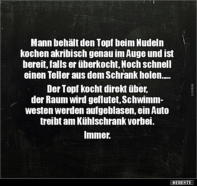 Mann behält den Topf beim Nudeln kochen akribisch genau im Auge und ist bereit, falls er überkocht, Noch schnell einen Teller aus dem Schrank holen..... Der Topf kocht direkt über, der Raum wird geflutet, Schwimm- westen werden aufgeblasen, ein Auto treibt am Kühlschrank vorbei. Immer.