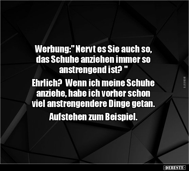 Werbung:" Nervt es Sie auch so, das Schuhe anziehen immer so anstrengend ist? " Ehrlich? Wenn ich meine Schuhe anziehe, habe ich vorher schon viel anstrengendere Dinge getan. Aufstehen zum Beispiel.