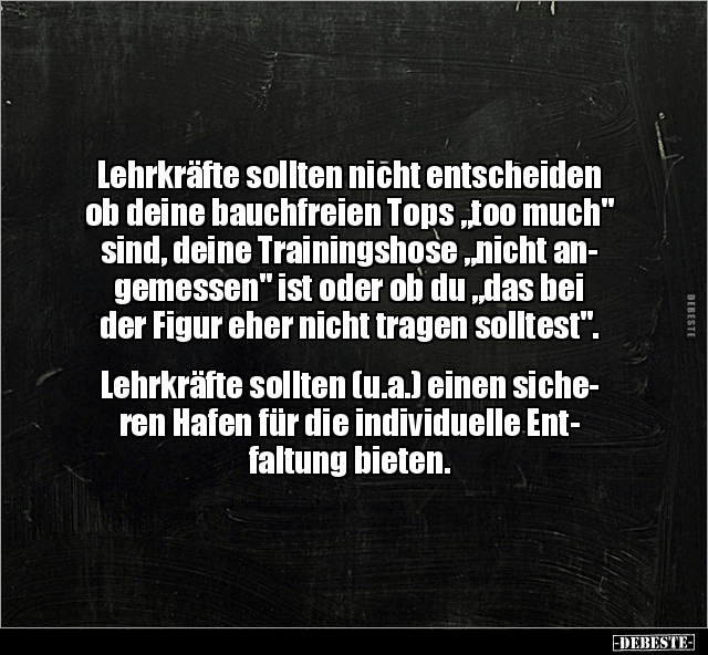 Lehrkräfte sollten nicht entscheiden ob deine bauchfreien Tops „too much" sind, deine Trainingshose „nicht an- gemessen" ist oder ob du „das bei der Figur eher nicht tragen solltest". Lehrkräfte sollten (u.a.) einen siche- ren Hafen für die individuelle Ent- faltung bieten.