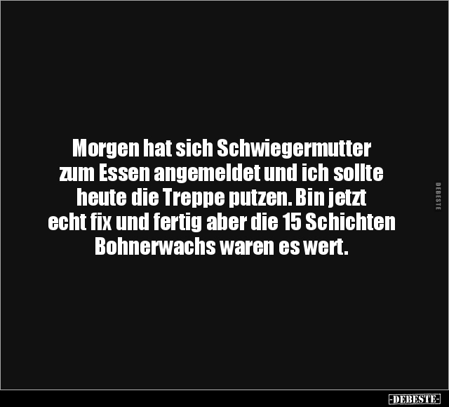 Morgen hat sich Schwiegermutter zum Essen angemeldet und ich sollte heute die Treppe putzen. Bin jetzt echt fix und fertig aber die 15 Schichten Bohnerwachs waren es wert.