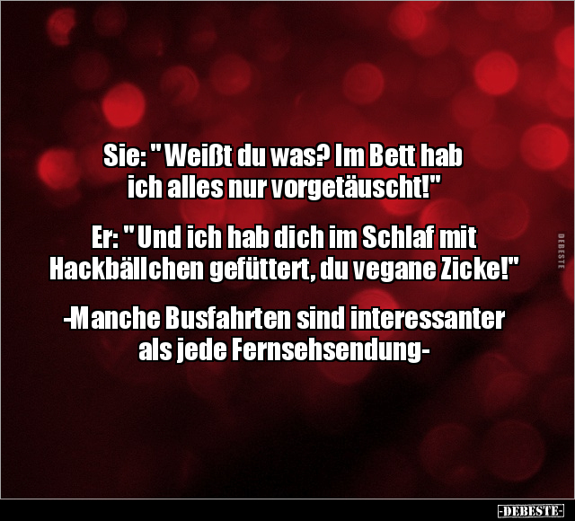 Sie: " Weißt du was? Im Bett hab ich alles nur vorgetäuscht!" Er: " Und ich hab dich im Schlaf mit Hackbällchen gefüttert, du vegane Zicke!" -Manche Busfahrten sind interessanter als jede Fernsehsendung-