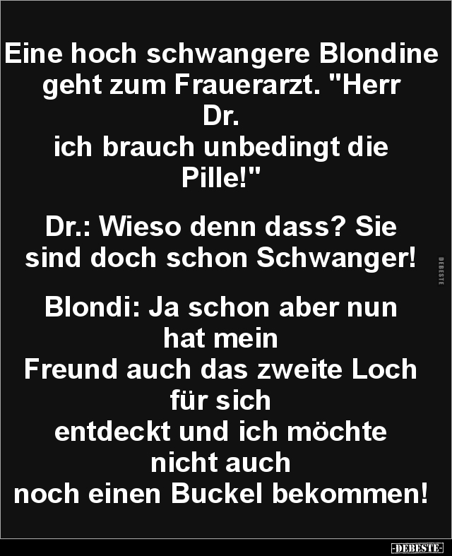 Eine hoch schwangere Blondine geht zum Frauerarzt. "Herr Dr. ich brauch unbedingt die Pille!" Dr.: Wieso denn dass? Sie sind doch schon Schwanger! Blondi: Ja schon aber nun hat mein Freund auch das zweite Loch für sich entdeckt und ich möchte nicht auch noch einen Buckel bekommen!