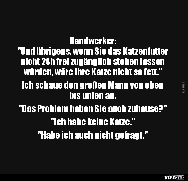 Handwerker: "Und übrigens, wenn Sie das Katzenfutter nicht 24h frei zugänglich stehen lassen würden, wäre Ihre Katze nicht so fett." Ich schaue den großen Mann von oben bis unten an. "Das Problem haben Sie auch zuhause?" "Ich habe keine Katze." "Habe ich auch nicht gefragt."