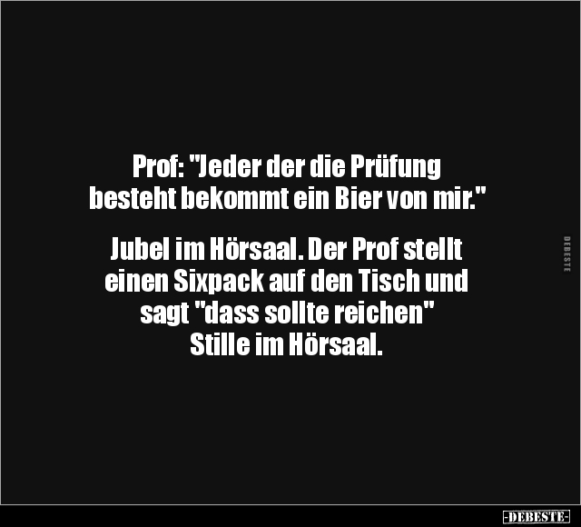 Prof: "Jeder der die Prüfung besteht bekommt ein Bier von mir." Jubel im Hörsaal. Der Prof stellt einen Sixpack auf den Tisch und sagt "dass sollte reichen" Stille im Hörsaal.