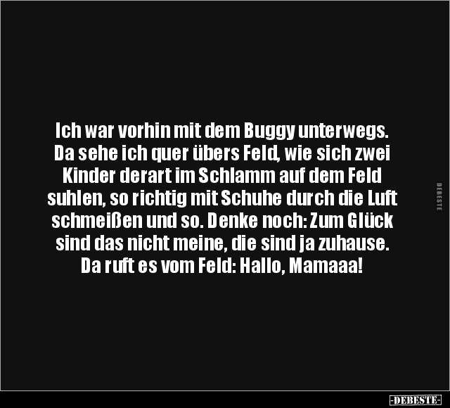 Ich war vorhin mit dem Buggy unterwegs. Da sehe ich quer übers Feld, wie sich zwei Kinder derart im Schlamm auf dem Feld suhlen, so richtig mit Schuhe durch die Luft schmeißen und so. Denke noch: Zum Glück sind das nicht meine, die sind ja zuhause. Da ruft es vom Feld: Hallo, Mamaaa!