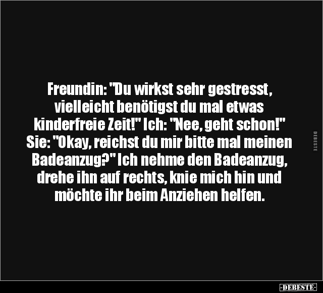Freundin: "Du wirkst sehr gestresst, vielleicht benötigst du mal etwas kinderfreie Zeit!" Ich: "Nee, geht schon!" Sie: "Okay, reichst du mir bitte mal meinen Badeanzug?" Ich nehme den Badeanzug, drehe ihn auf rechts, knie mich hin und möchte ihr beim Anziehen helfen.