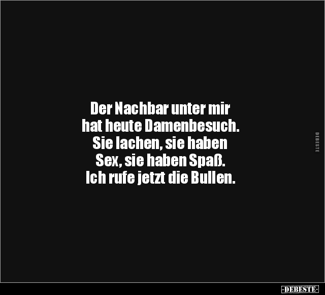 Der Nachbar unter mir hat heute Damenbesuch. Sie lachen, sie haben Sex, sie haben Spaß. Ich rufe jetzt die Bullen.