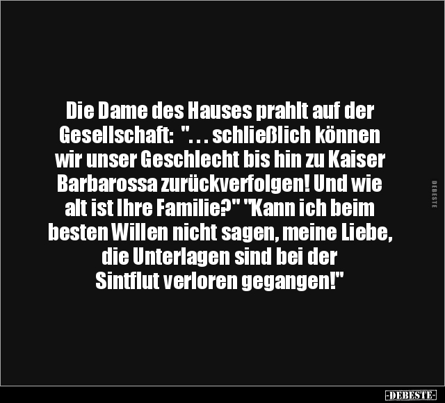 Die Dame des Hauses prahlt auf der Gesellschaft: ". . . schließlich können wir unser Geschlecht bis hin zu Kaiser Barbarossa zurückverfolgen! Und wie alt ist Ihre Familie?" "Kann ich beim besten Willen nicht sagen, meine Liebe, die Unterlagen sind bei der Sintflut verloren gegangen!"