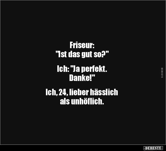 Friseur: "Ist das gut so?" Ich: "Ja perfekt. Danke!" Ich, 24, lieber hässlich als unhöflich.
