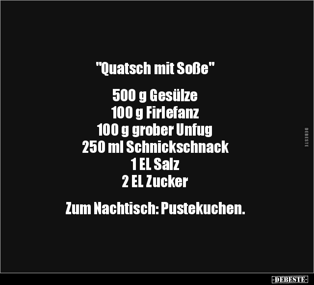 "Quatsch mit Soße" 500 g Gesülze 100 g Firlefanz 100 g grober Unfug 250 ml Schnickschnack 1 EL Salz 2 EL Zucker Zum Nachtisch: Pustekuchen.