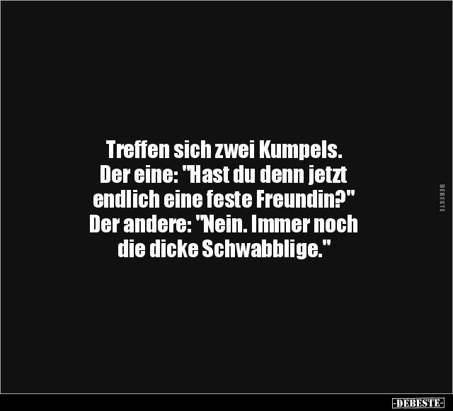 Treffen sich zwei Kumpels. Der eine: "Hast du denn jetzt endlich eine feste Freundin?" Der andere: "Nein. Immer noch die dicke Schwabblige."