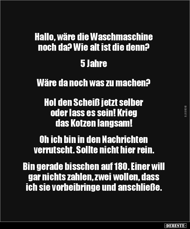 Hallo, wäre die Waschmaschine noch da? Wie alt ist die denn? 5 Jahre Wäre da noch was zu machen? Hol den Scheiß jetzt selber oder lass es sein! Krieg das Kotzen langsam! Oh ich bin in den Nachrichten verrutscht. Sollte nicht hier rein. Bin gerade bisschen auf 180. Einer will gar nichts zahlen, zwei wollen, dass ich sie vorbeibringe und anschließe.