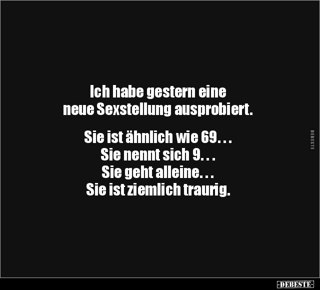 Ich habe gestern eine neue Sexstellung ausprobiert. Sie ist ähnlich wie 69. . . Sie nennt sich 9. . . Sie geht alleine. . . Sie ist ziemlich traurig.