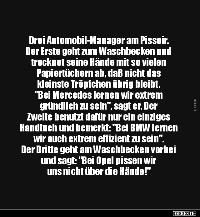 Drei Automobil-Manager am Pissoir. Der Erste geht zum Waschbecken und trocknet seine Hände mit so vielen Papiertüchern ab, daß nicht das kleinste Tröpfchen übrig bleibt. "Bei Mercedes lernen wir extrem gründlich zu sein", sagt er. Der Zweite benutzt dafür nur ein einziges Handtuch und bemerkt: "Bei BMW lernen wir auch extrem effizient zu sein". Der Dritte geht am Waschbecken vorbei und sagt: "Bei Opel pissen wir uns nicht über die Hände!"