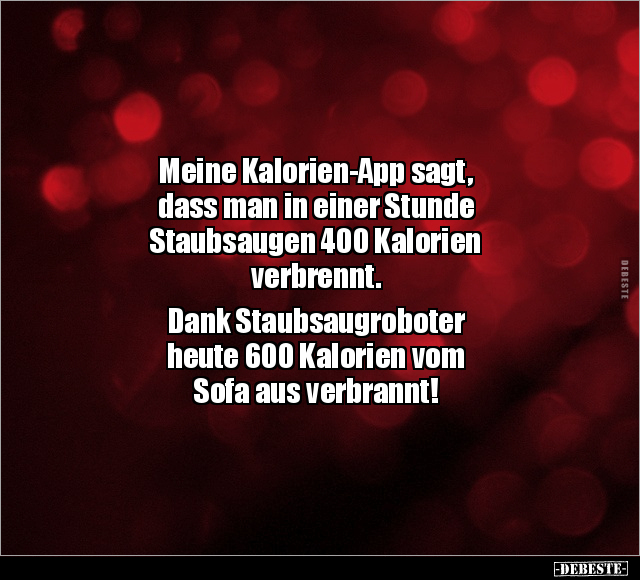Meine Kalorien-App sagt, dass man in einer Stunde Staubsaugen 400 Kalorien verbrennt. Dank Staubsaugroboter heute 600 Kalorien vom Sofa aus verbrannt!