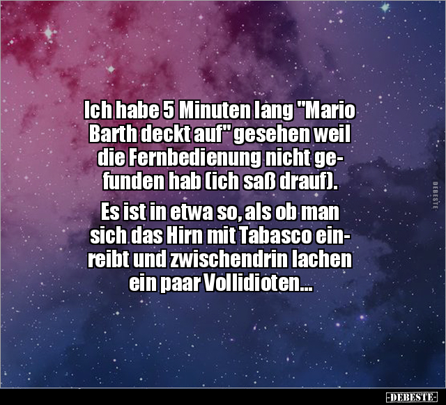 Ich habe 5 Minuten lang "Mario Barth deckt auf" gesehen weil die Fernbedienung nicht ge- funden hab (ich saß drauf). Es ist in etwa so, als ob man sich das Hirn mit Tabasco ein- reibt und zwischendrin lachen ein paar Vollidioten...