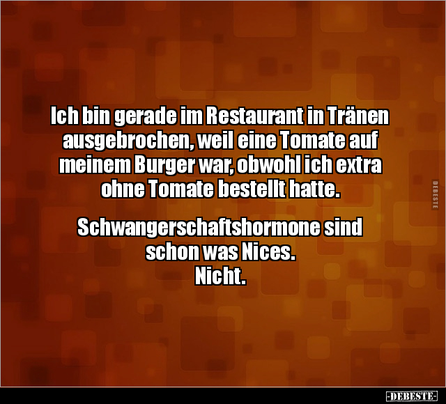 Ich bin gerade im Restaurant in Tränen ausgebrochen, weil eine Tomate auf meinem Burger war, obwohl ich extra ohne Tomate bestellt hatte. Schwangerschaftshormone sind schon was Nices. Nicht.