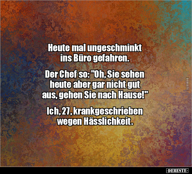 Heute mal ungeschminkt ins Büro gefahren. Der Chef so: "Oh, Sie sehen heute aber gar nicht gut aus, gehen Sie nach Hause!" Ich, 27, krankgeschrieben wegen Hässlichkeit.