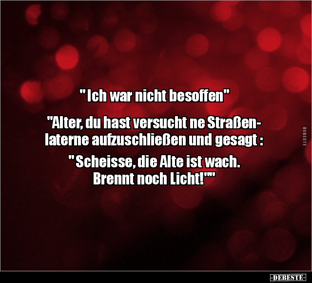 " Ich war nicht besoffen" "Alter, du hast versucht ne Straßen- laterne aufzuschließen und gesagt : " Scheisse, die Alte ist wach. Brennt noch Licht!""