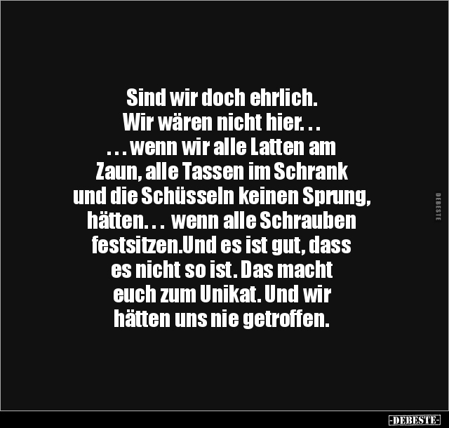 Sind wir doch ehrlich. Wir wären nicht hier. . . . . . wenn wir alle Latten am Zaun, alle Tassen im Schrank und die Schüsseln keinen Sprung, hätten. . . wenn alle Schrauben festsitzen.Und es ist gut, dass es nicht so ist. Das macht euch zum Unikat. Und wir hätten uns nie getroffen.