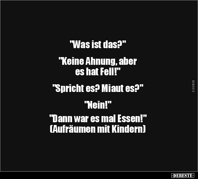 "Was ist das?" "Keine Ahnung, aber es hat Fell!" "Spricht es? Miaut es?" "Nein!" "Dann war es mal Essen!" (Aufräumen mit Kindern)