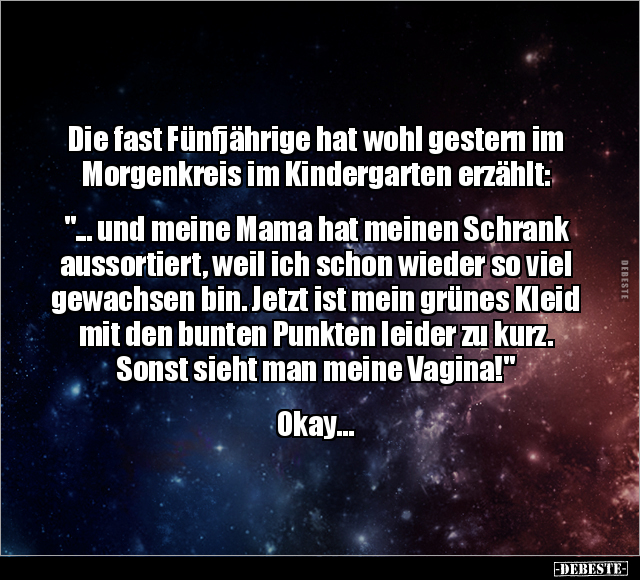 Die fast Fünfjährige hat wohl gestern im Morgenkreis im Kindergarten erzählt: "... und meine Mama hat meinen Schrank aussortiert, weil ich schon wieder so viel gewachsen bin. Jetzt ist mein grünes Kleid mit den bunten Punkten leider zu kurz. Sonst sieht man meine Vagina!" Okay...