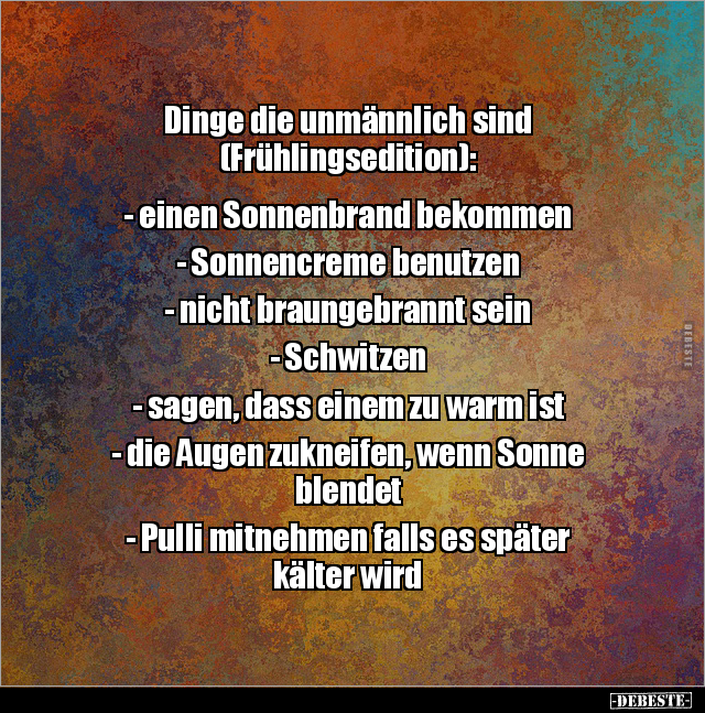 Dinge die unmännlich sind (Frühlingsedition): - einen Sonnenbrand bekommen - Sonnencreme benutzen - nicht braungebrannt sein - Schwitzen - sagen, dass einem zu warm ist - die Augen zukneifen, wenn Sonne blendet - Pulli mitnehmen falls es später kälter wird