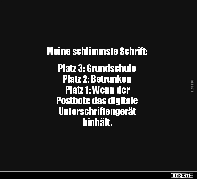 Meine schlimmste Schrift: Platz 3: Grundschule Platz 2: Betrunken Platz 1: Wenn der Postbote das digitale Unterschriftengerät hinhält.