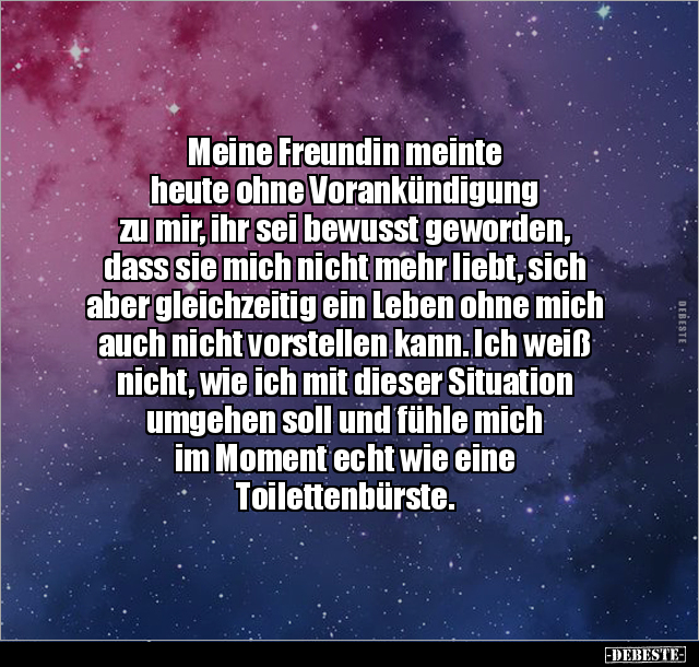 Meine Freundin meinte heute ohne Vorankündigung zu mir, ihr sei bewusst geworden, dass sie mich nicht mehr liebt, sich aber gleichzeitig ein Leben ohne mich auch nicht vorstellen kann. Ich weiß nicht, wie ich mit dieser Situation umgehen soll und fühle mich im Moment echt wie eine Toilettenbürste.
