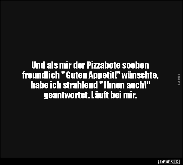 Und als mir der Pizzabote soeben freundlich " Guten Appetit!" wünschte, habe ich strahlend " Ihnen auch!" geantwortet. Läuft bei mir.