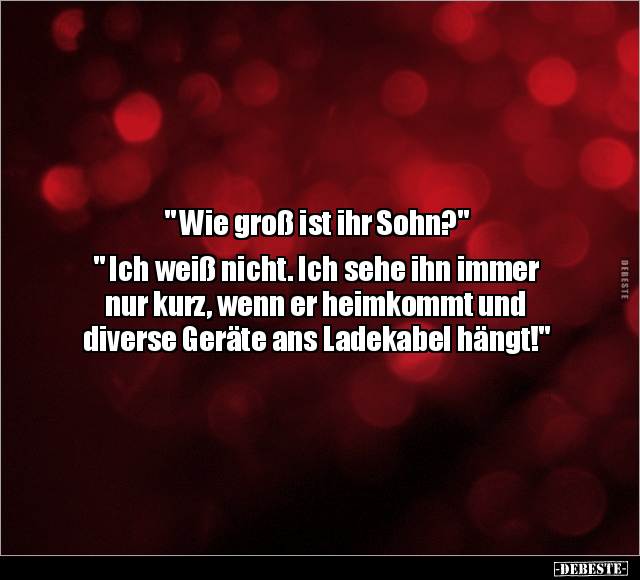 " Wie groß ist ihr Sohn?" " Ich weiß nicht. Ich sehe ihn immer nur kurz, wenn er heimkommt und diverse Geräte ans Ladekabel hängt!"