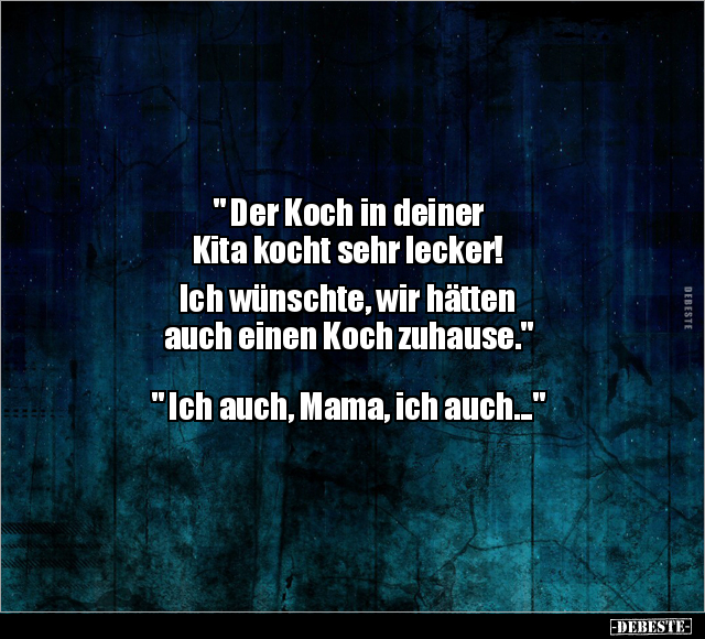 " Der Koch in deiner Kita kocht sehr lecker! Ich wünschte, wir hätten auch einen Koch zuhause." " Ich auch, Mama, ich auch..."