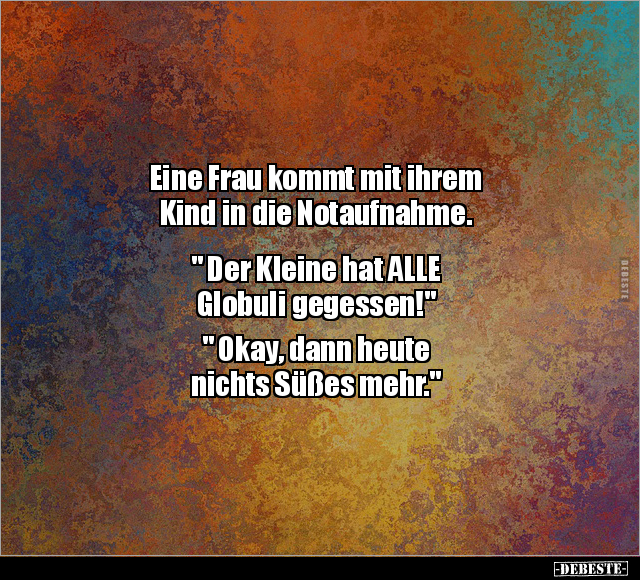 Eine Frau kommt mit ihrem Kind in die Notaufnahme. " Der Kleine hat ALLE Globuli gegessen!" " Okay, dann heute nichts Süßes mehr."