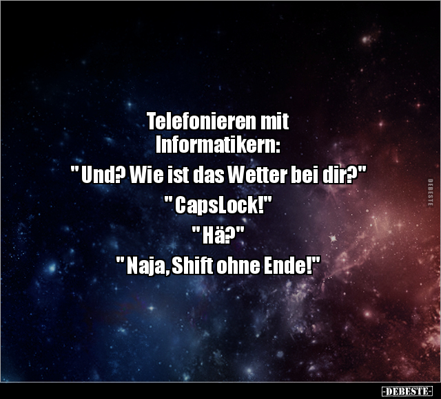 Telefonieren mit Informatikern: " Und? Wie ist das Wetter bei dir?" " CapsLock!" " Нä?" " Naja, Shift ohne Ende!"