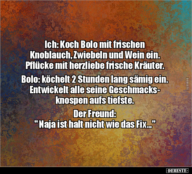 Ich: Koch Bolo mit frischen Knoblauch, Zwiebeln und Wein ein. Pflücke mit herzliebe frische Kräuter. Bolo: köchelt 2 Stunden lang sämig ein. Entwickelt alle seine Geschmacks- knospen aufs tiefste. Der Freund: " Naja ist halt nicht wie das Fix..."