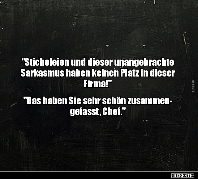 "Sticheleien und dieser unangebrachte Sarkasmus haben keinen Platz in dieser Firma!" "Das haben Sie sehr schön zusammen- gefasst, Chef."