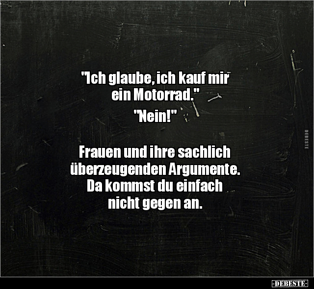 "Ich glaube, ich kauf mir ein Motorrad." "Nein!" Frauen und ihre sachlich überzeugenden Argumente. Da kommst du einfach nicht gegen an.