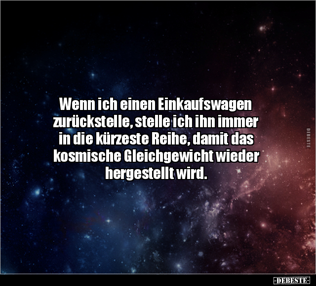 Wenn ich einen Einkaufswagen zurückstelle, stelle ich ihn immer in die kürzeste Reihe, damit das kosmische Gleichgewicht wieder hergestellt wird.