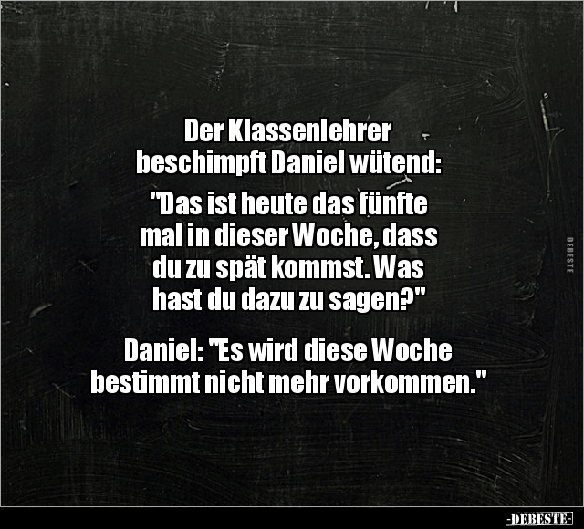 Der Klassenlehrer beschimpft Daniel wütend: "Das ist heute das fünfte mal in dieser Woche, dass du zu spät kommst. Was hast du dazu zu sagen?" Daniel: "Es wird diese Woche bestimmt nicht mehr vorkommen."