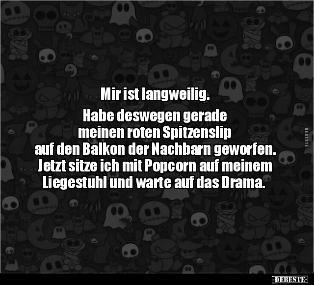Mir ist langweilig. Habe deswegen gerade meinen roten Spitzenslip auf den Balkon der Nachbarn geworfen. Jetzt sitze ich mit Popcorn auf meinem Liegestuhl und warte auf das Drama.