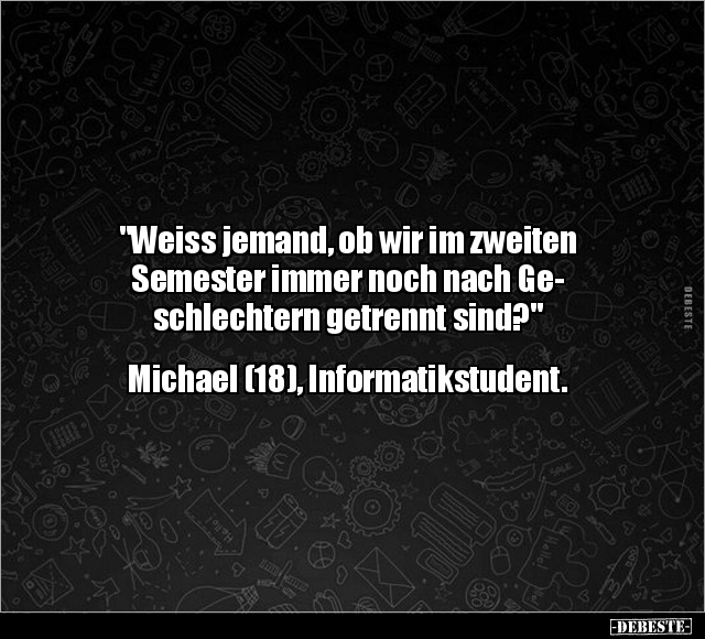 "Weiss jemand, ob wir im zweiten Semester immer noch nach Ge- schlechtern getrennt sind?" Michael (18), Informatikstudent.