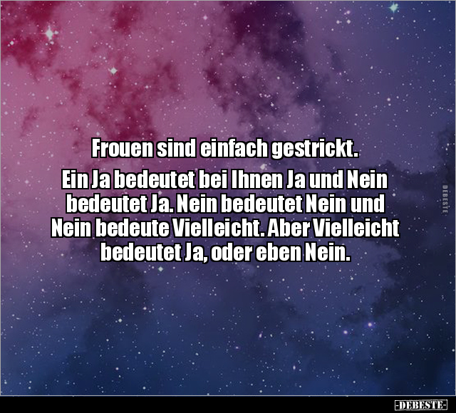 Frouen sind einfach gestrickt. Ein Ja bedeutet bei Ihnen Ja und Nein bedeutet Ja. Nein bedeutet Nein und Nein bedeute Vielleicht. Aber Vielleicht bedeutet Ja, oder eben Nein.